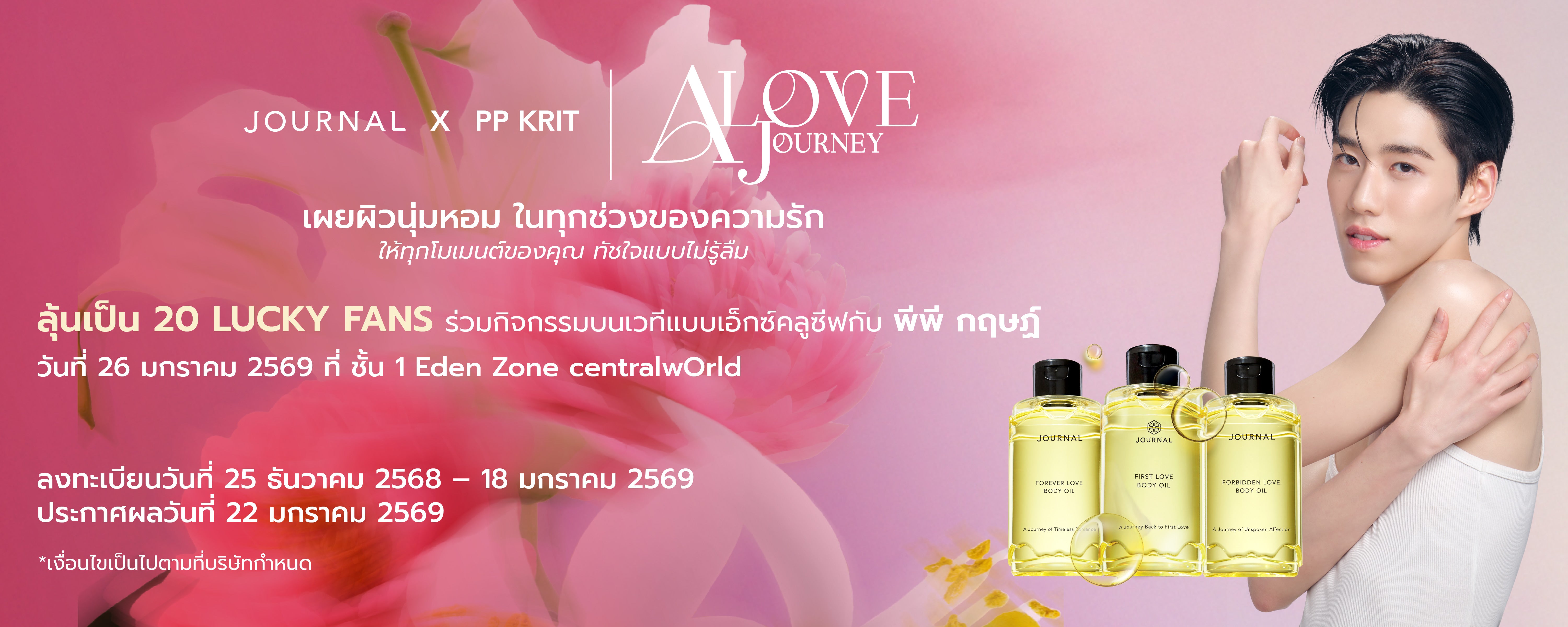 JOURNAL ชวนทุกท่านร่วมสัมผัสประสบการณ์พิเศษในกิจกรรม A Love Journey เผยผิวนุ่มหอม ในทุกช่วงของความรัก กิจกรรมที่ถ่ายทอดเรื่องราวของความรักผ่านกลิ่นหอมและผิวโกลว์สวยจาก JOURNAL Body Oil พร้อมการกลับมาอีกครั้งของ พีพี กฤษฏ์ ในโมเมนต์สุดเอ็กซ์คลูซีฟสำหรับลูกค้า JOURNAL เท่านั้น